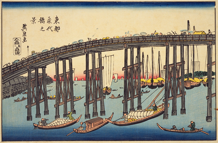 孫橋の向う、鴨川側には黒山の人だかりがあり、戸板に乗せられ番太が前後で提げ、三条大橋に向き歩き出しているそれへ